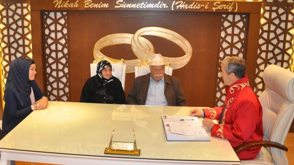 "Eşim ölmüştü, Zekiye'nin de eşi ölmüştü. Ben yalnız yaşamak zor olduğu için evlenmeye karar verdim. Yaşım ilerlemiş olduğu için kimse bana bakmadı. Sonra gelinim aracılığı ile hanımefendi ile tanıştık. Beni kabul etti, bende kendisini beğendim. 5 yıl önce dini nikah kıyarak yaşamaya başladık. Ben ölürsem eşim perişan olmasın diye resmi nikah kıymaya karar verdik buraya geldik. Mutluyuz."
