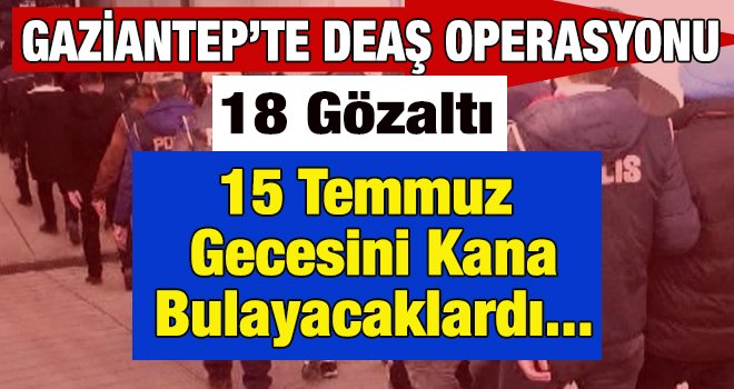 Gaziantep’te DEAŞ terör örgütüne yönelik yapılan operasyonda 18 kişi gözaltına alındı. Örgüt üyelerinin amacı 15 Temmuz gecesinde sansasyonel eylem yapıp geceyi kana bulayacaklardı.Sanıklardan 5 kişi tutuklanarak cezaevine konuldu.