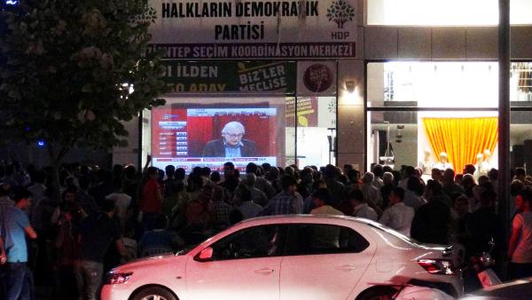 HDP'nin kent merkezindeki Seçim Koordinasyon Merkezi'nin önüne kurulan dev ekrandan seçim sonuçlarını takip eden partililer, HDP'nin barajını geçeceğinin resmi olmayan sonuçlara göre kesinleşmesiyle büyük sevinç yaşadı. HDP üyeleri yine resmi olmayan sonuçlara göre Gaziantep'ten 2 milletvekilini TBMM'ye gönderecek olmanın mutluluğuyla zafer işareti yaparak slogan attı. HDP'lilerin sevinç gösterisine yoldan geçen bazı sürücüler de korna çalarak destek verdi.
