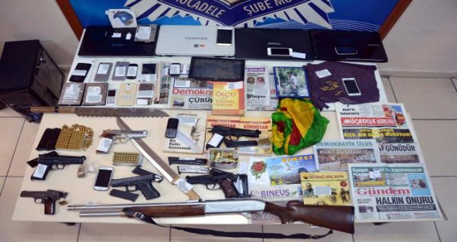 Geçen hafta perşembe günü, terör örgütü PKK adına korsan gösteri düzenleyip, propaganda yaptığı ve kepenk kapatılması için işyerlerine baskı yaptığı saptanan kişilere yönelik polis operasyon kararı aldı. Havadan drone aracı ile görüntü alınan ve zırhlı araçlarla 250 polisin katılımıyla düzenlenen operasyonda, çok sayıda ev ve işyerine baskın düzenlendi. Operasyonda polis ekipleri 16 kişiyi gözaltına alırken, bu kişilerin ev ve işyerlerinde 5 tabanca, çok sayıda mermi, 1 av tüfeği, 1 kurusıkı tabanca, 2 bıçak, PKK/KCK terör örgütü içerikli kitap, dergi, fotoğraf, örgütsel dokümanlar, bazı elektronik malzemeler ile FETÖ/PDY terör örgütü elebaşının yazdığı 1 kitap ve 1 CD ele geçirildi.