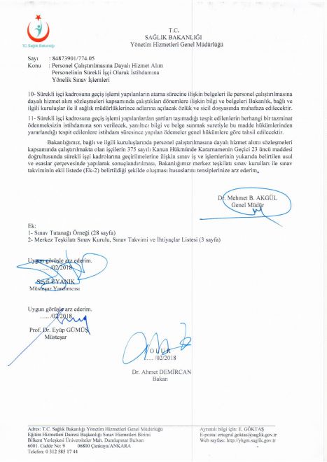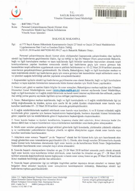 İl Sağlık Müdürlüğünde görevli personel müdürlükte oluşturulacak komisyon tarafından, diğer hastanelerde çalışan taşeron işçiler ise kendi hastanelerinde Başhekim başkanlığında kurulacak komisyon tarafından sözlü sınav yapılacaktır.