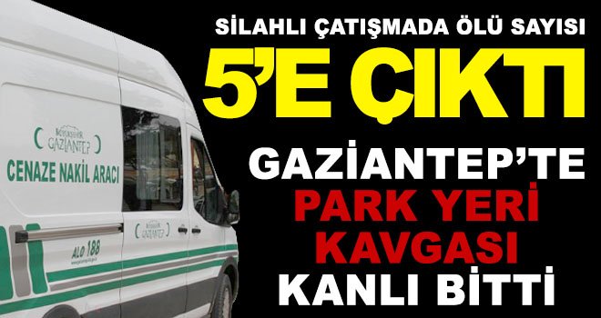 Gaziantep'te komşu aileler arasında araç park yeri nedeniyle çıkan ve av tüfeklerinin kullanıldığı kavgada 4 kişi öldüğü, 4 kişi yaralandığı kavgada ölü sayısı 5’e yükseldi. Edilinen son bilgilere göre olay yerinde yaralan bir kişi tedavi gördüdüğü hastanede doktorların tüm müdahalelerine rağmen kurtarılamayarak hayatını kaybetti.