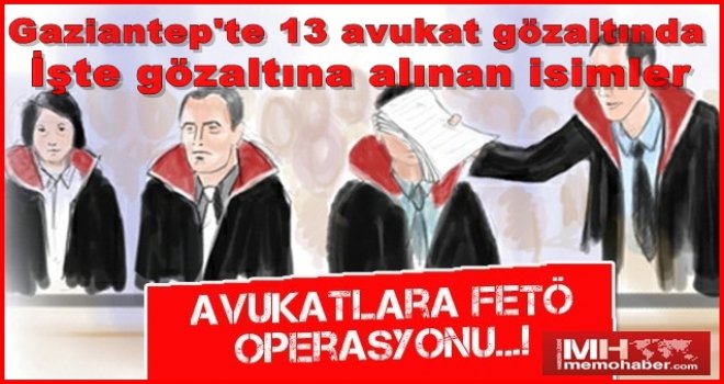 Gaziantep’te Fethullahçı Terör Örgütü/Paralel Devlet Yapılanması'na (FETÖ/PDY) yönelik operasyonda 13 avukat gözaltına alındı. İşte gözaltına alınan kapatılan Müdafa-i Hukuk Derneği'ne üye avukatların isimleri...