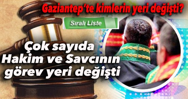 Gaziantep Bölge İdare Mahkemesi Üyesi Hüseyin Aydemir Gaziantep Vergi Mahkemesi Başkanlığı’na, Edirne Vergi Mahkmesi Üyesi Osman Ala Gaziantep Vergi Mahkemesi Üyeliği’ne, Gaziantep Bölge Adliye Mah. Cumhuriyet Savcısı Mehmet Sevim Gaziantep Bölge Adliye Mahkemesi Üyeliği’ne, Gaziantep Bölge Adliye Mahkemesi Cumhuriyet Savcısı Remzi Deveci Gaziantep Bölge Adliye Mahkemesi Üyeliği’ne, Gaziantep Bölge Adliye Mahkemesi Üyesi Cuma Öztürk Kahramanmaraş Hâkimliği’ne, Balıkesir Hâkimi Murat Çolak Gaziantep Ağır Ceza Mahkemesi Başkanlığı’na, Gaziantep Bölge Adliye Mahkemesi Üyesi Muhsin Yatağan Diyarbakır Ağır Ceza Mahkemesi Başkanlığı’na, Antalya Bölge Adliye Mahkemesi Üyesi Feramuz Tekbıyık Gaziantep Bölge Adliye Mahkemesi Üyeliği’ne, İstanbul Hâkimi Mehmet Arslan Gaziantep Ağır Ceza Mahkemesi Başkanlığı’na, Gaziantep Bölge Adliye Mahkemesi Cumhuriyet Savcısı Ali Arslan Gaziantep Bölge Adliye Mahkemesi Üyeliği’ne, Fatsa Cumhuriyet Savcısı Asım Kaya Gaziantep Cumhuriyet Savcılığı’na, Bursa Hâkimi Murat Emre Sakalsız Gaziantep Bölge Adliye Mahkemesi Üyeliği’ne, Yalova Hâkimi Abidin Öztürk Gaziantep Bölge Adliye Mahkemesi Üyeliği’ne, Gaziantep Bölge Adliye Mahkemesi Cumhuriyet Savcısı Zafer Yiğit Gaziantep Bölge Adliye Mahkemesi Üyeliği’ne, Gaziantep Hâkimi Fatih Dulkadir Gaziantep Bölge Adliye Mahkemesi Üyeliği’ne, Dörtyol Hâkimi Elif Çerçi Gaziantep Hâkimliği’ne, Gaziantep Cumhuriyet Savcısı Mehmet Mülhim Diyarbakır Hâkimliği’ne, Alaçam Cumhuriyet Savcısı Aziz Kocaağa Gaziantep Cumhuriyet Savcılığı’na, Karamürsel Hâkimi Sibel Başaran Gaziantep Hâkimliği’ne, Tokat Hâkimi Abdulvahit Çınar Gaziantep Hâkimliği’ne, Gölcük Cumhuriyet SavcısıTuğçe Çitçi Gaziantep Cumhuriyet Savcılığı’na, Hayrabolu Hâkimi Halime Savaş Öztürk Gaziantep Hâkimliği’ne, Keşan Cumhuriyet Savcısı Sinan Yüksel Gaziantep Cumhuriyet Savcılığı’na, Alaşehir Cumhuriyet Savcısı Mustafa Arı Gaziantep Cumhuriyet Savcılığı’na, Karamürsel Cumhuriyet Savcısı Serkan Başaran Gaziantep Cumhuriyet Savcılığı’na, Bartın Hâkimi Osman Ay Gaziantep Hâkimliği’ne, Bartın Hâkimi Songül Tekeş Gaziantep Hâkimliği’ne, Giresun Cumhuriyet Savcısı Soner Erden Gaziantep Cumhuriyet Savcılığı’na, Turgutlu Hâkimi Zehra Çiftci Gaziantep Hâkimliği’ne, Hayrabolu Cumhuriyet Savcısı Cihat Öztürk Gaziantep Cumhuriyet Savcılığı’na, Gelibolu Hâkimi Demet Tek Gaziantep Hâkimliği’ne, Giresun Hâkimi Orhan Gündoğdu Gaziantep Hâkimliği’ne, Turgutlu Cumhuriyet Savcısı Halis Çiftci Gaziantep Cumhuriyet Savcılığı’na, Mustafakemalpaşa Hâkimi Ahmet Bulut Gaziantep Hâkimliği’ne, Gökçeada Cumhuriyet Savcısı Elif Kürüm Çelik Gaziantep Cumhuriyet Savcılığı’na, Fatsa Hâkimi Emrullah Balık Gaziantep Hâkimliği’ne, Vakfıkebir Cumhuriyet Savcısı Ebru Baran Celep Gaziantep Cumhuriyet Savcılığı’na, Bafra Cumhuriyet Savcısı Abdülbaki Ay Gaziantep Cumhuriyet Savcılığı’na, Yozgat Hâkimi İbrahim Hatipoğlu Gaziantep Hâkimliği’ne, Ereğli (Zonguldak) Cumhuriyet Savcısı Gökhan Yüksel Gaziantep Cumhuriyet Savcılığı’na, Mustafakemalpaşa Cumhuriyet Savcısı Ahmet Kaya Gaziantep Cumhuriyet Savcılığı’na, Alaşehir Hâkimi Buket Çelik Arı Gaziantep Hâkimliği’ne, Gaziantep Cumhuriyet Savcısı Bülent Bilgin Bandırma Cumhuriyet Savcılığı’na, Gaziantep Hâkimi Mahmut Dağ Çerkezköy Hâkimliği’ne, Gaziantep Cumhuriyet Savcısı Burak Akkurt Manavgat Cumhuriyet Savcılığı’na, Gaziantep Hâkimi Duygu Akkurt Manavgat Hâkimliği’ne, Gaziantep Cumhuriuyet Savcısı Hüseyin Demir Kilis Cumhuriyet Savcılığı’na, Gaziantep Cumhuriyet Savcısı Tuba Muştu Alaşehir Cumhuriyet Savcılığı’na atandı.