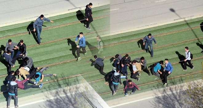 Gaziantep'te, lise öğrencisi iki grup şehir merkezinde tekme tokat birbirine girdi. Emniyet Müdürlüğü'nün bulunduğu cadde üzerindeki tramvay hattında öğrencilerin kavgası görenleri şaşkına çevirdi.