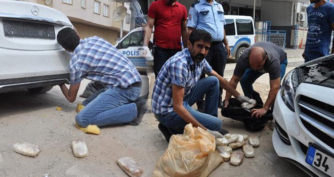 Gaziantep'in İslahiye İlçesi'nde, polis 3 gündür ayrı noktada park halinde durduğu için şüphe üzerine aradığı otomobilde 36 kilo esrar ele geçirdi. Esrara el koyan polis, otomobilin sahibi olan ve otelde konaklayan Suriye uyruklu 3 kişiyi gözaltına aldı.