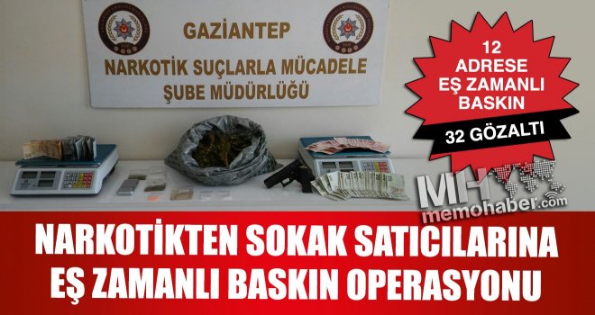 Gaziantep'te uyuşturucu tacirlerine yönelik 12 adrese eşzamanlı operasyon düzenlendi. Sokak satıcılarından 32 kişi gözaltına alındı.