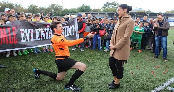 Hakem Göktuğ Kutlu, kız arkadaşı stajyer hakim Leyla Kögüstün'a yeşil sahada evlilik teklif etti. Leyla Kögüstün tek taş pırlantayı parmağına takarak Kutlu'nun teklifini kabul etti.