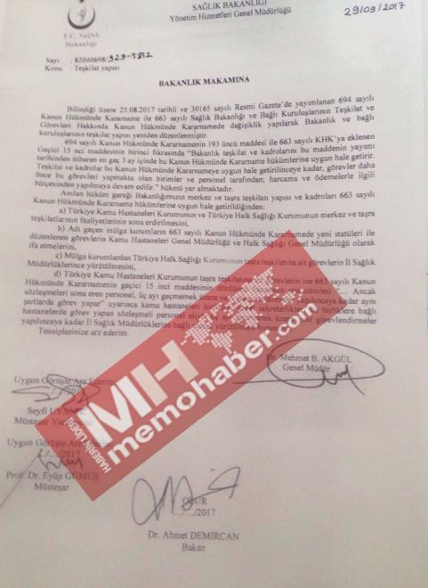 T.C Sağlık Bakanlığı ve bağlı kurumların birleşmesi ile ilgili karar verildi ve beklenen oldu. Resmi Gazete’de yayımlanan 694 Sayılı KHK ile Kamu Hastaneler Genel Sekreterliği ve Türkiye Halk Sağlığı Kurumu kapatılacak yerlerine ise Halk Sağlığı Genel Müdürlüğü ile Kamu Hastaneleri Genel Müdürlüğü kurulacak. OHAL kapsamında yayınlanan yeni KHK'da 663 Sayılı Sağlık Bakanlığı ve Bağlı Kuruluşlarının Teşkilat Ve Görevleri Hakkında Kanun Hükmünde Kararname’de yapılan değişikliklerle Türkiye Halk Sağlığı Kurumu ile Türkiye Kamu Hastaneleri Kurumu kaldırılarak yerlerine Halk Sağlığı Genel Müdürlüğü ile Kamu Hastaneleri Genel Müdürlüğü kuruldu. İllerde yer alan Kamu Hastaneleri Genel Sekreterlikleri kapatıldı. Sağlık Bakanlığı teşkilat yapısında ise önemli değişiklikler yapıldı. Kamu hastaneleri birlikleri genel sekreterlikleri ile birliklere bağlı hastanelerde görevli sözleşmeli personelin sözleşmeleri KHK’nın yayımı tarihinde sona erdi. Bakanlığın il ve ihtiyaca göre kurulacak ilçe yönetim birimleri il ve ilçe sağlık müdürlükleri olacak.