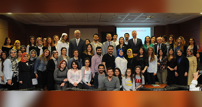 Doç. Dr. Tuna’ya konuşmasının ardından SANKO Üniversitesi Rektör Vekili Prof. Dr. Güner Dağlı ve SBF Dekan Vekili Prof. Dr. Türkan Pasinlioğlu tarafından çiçek takdim edildi.