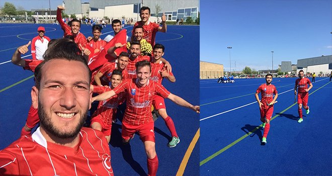 Kopenhag’da düzenlenen şampiyonanın güçlü takımlarından Copenhagen HC takımını Mahmut’un 3 ve Hasan’ın 1 golüyle 4-1’lik skorla yenerek finallere yükselen Gaziantep Polisgücü takımı oyuncuları sevinçlerini sahada Türk bayrağı açarak gösterdi.