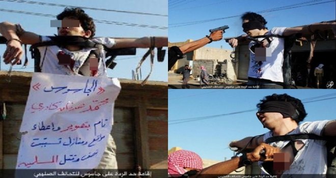 IŞİD’in Suriye’deki başkenti Rakka’da başkaları hesabına casusluk yapmakla suçlanarak idama mahkum edilen Muhammed El Kadri adlı bir genç, kentin en kalabalık meydanlarından birinde, önce çarmıha gerildi. Daha sonra bir infazcı elindeki bıçağı gencin kalbine sapladı ve son olarak da başka bir cellat tabancayla kurbanın alnına ateş etti.