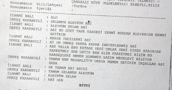 - İlhami Balı: Bunları müsait zamanda geçiririm. Beni arayıp, yerlerini söylesinler. Hemen araba gönderip, aldırırım. Jandarma şu an onların üzerine gitti. Çabuk ara, oldukları yerden ayrılsınlar. Gerekirse Antep'e gitsinler. Jandarma onları arıyor.