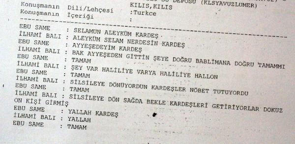 - İlhami Balı: Her tarafta jandarma, istihbarat var. Sadece 6 isim yazmışsın. Saçma iş yapıyorsun. İnşallah bu adamlar yakalanmaz. Eğer bir şey olursa seninle görüşürüm. Bunları 80 defa başka yerden almıştım. Ortada kalmış, ne sağa, ne sola gidebiliyorlar.