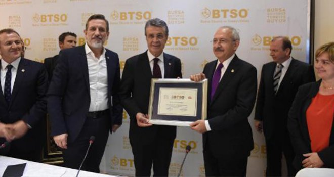 CHP Genel Başkanı Kemal Kılıçdaroğlu ise BTSO Yönetim Kurulu Başkanı İbrahim Burkay’ı gerçekleştirdikleri projelerden ötürü kutladı. Parti olarak gizli ajandaları olmadığını belirten Kılıçdaroğlu, eğitimde, adalet sisteminde ve ekonomide hedefledikleri projeleri söyledi.