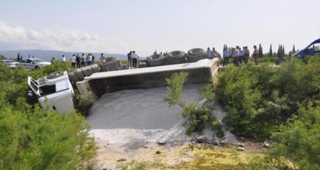 Kaza, bugün saat 16.00 sıralarında, Küme Evleri Mevkii'ndeki Yalkıdere Çayı'nda meydana geldi. Söke'den İncirliova'da bir inşaat firmasına kum taşıyan Coşkun Şahin, yönetimindeki 06 DC 7190 plakalı kamyonun direksiyon hakimiyetini yitirdi. Yoldan çıkan kamyon, içinde bir miktar su bulunan Yalkıdere Çayı'na devrildi. Kamyon şoförü Şahin, kazada yaralandı. İhbar üzerine kaza yerine gelen sağlık ekipleri, yaralı Şahin'i ambulansla Aydın Devlet Hastanesi'ne kaldırdı. Tedaviye alınan Şahin'in hayati tehlikesinin bulunmadığı bildirildi. Çay kenarına dökülen bir miktar kumun da toplanıp başka bir kamyona aktarılacağı, aracında çekici yardımıyla kaza yerinden kaldırılacağı belirtildi. Polis, kazayla ilgili soruşturma başlattı.