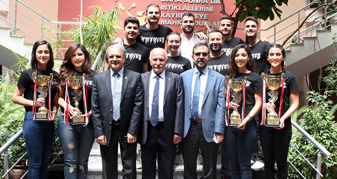 Hocaları Kürşat Korkmaz ve Murat Karataş ile birlikte ekip arkadaşları adına GAÜN Rektörü Prof. Dr. Ali Gür’ü makamında ziyaret eden halk oyunları ekibi öğrencilerinden Ahmet Tuzcu, Hacer Budamacı, Mustafa Ağbal, Melek Doğan, Ömer Mert Yavuz, Dilara Karadeniz, Yunus Aykan, Mehmet Akdemir, Gözde Özsoy ve Edanur Bozkurt, başarılarındaki katkılarından dolayı üniversite yönetimine teşekkür etti. Muğla’da yapılan ve Türkiye’nin 62 üniversitesinin halk oyunları ekibinin mücadele ettiği yarışmaların Bölge Yarışması Kategorisi’nde Stilize dalda 2’inci, genelde ise 1’inci olarak final hakkı elde ederek Türkiye Finali’ne katılma hakkı elde ittiklerini vurguladı. Türkiye Finali’nde ise Geleneksel Dalda Türkiye 2’si, Stilize dalda ise Türkiye 3’sü olarak toplamda 4 kupayı Gaziantep’e getirdiklerini kaydeden öğrenciler, önümüzdeki dönemlerde daha önemli başarılara imza atma sözü verdi.