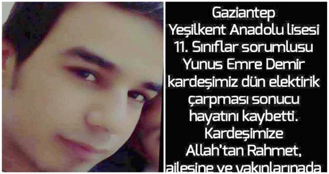 Gaziantep'te Yeşilkent Anadolu Lisesi 11. sınıf öğrencisi Yunus Emre Demir, okulların tatil olmasıyla para kazanmak için girdiği iş yerinde elektrik çarpması sonucu hayatını kaybetti.