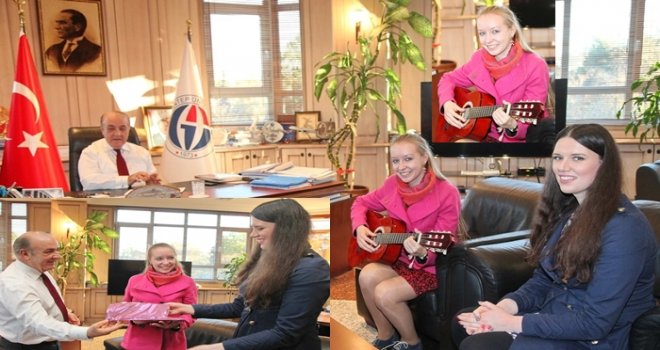 GAÜN Türk Musikisi Devlet Konservatuarı öğretim elemanlarının geçtiğimiz Nisan Ayı’nda Litvanya’da düzenlediği Türk Halk Oyunları ve Halk Türküleri Kursu’na da katılan Vilnius Üniversitesi Oryantalistik Enstitüsü Türkoloji Bölümü öğrencileri Augustina Şalkausaite ve İeva Kişonaite, Rektör Prof. Dr. Yavuz Coşkun’u makamında ziyaret etti. Fen Edebiyat Fakültesi Öğretim Üyesi Yrd. Doç. Dr. Celal Varışoğlu’nun da bulunduğu ziyarette Litvanyalı öğrenciler, gitar eşliğinde Üsküdar’a gider iken aldığı da bir yağmur şarkısını söyledi. Rektör Coşkun da öğrencilerin Türkçe olarak seslendirdiği şarkıya eşlik etti. Öğrenciler, geçtiğimiz Nisan Ayı’nda ülkelerinde düzenlenen kurslarda Türk kültürüne tanıma fırsatı bulduklarını ve bundan çok etkilendiklerini belirtti. Coşkun da Litvanyalı öğrencilere ziyaretinden dolayı teşekkür ederek fular hediye etti.