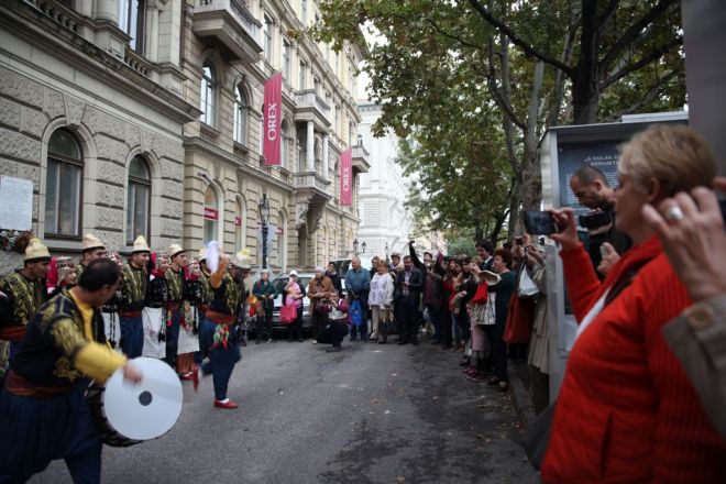Halk oyunları ekibinin fes ve cepkenlerini giyerek onlara eşlik eden Macarlılar, onlarla halay çekti.
