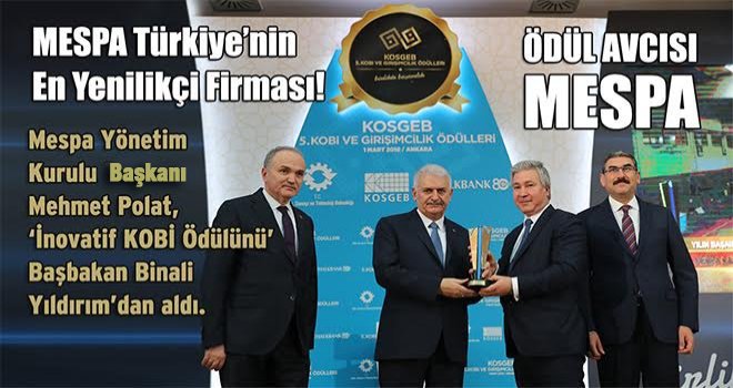 KOSGEB tarafından geleneksel olarak düzenlenen KOBİ ve Girişimcilik Ödül Töreninin 5. sinde, 9 kategoride finale kalan işletmeler arasından birinci seçilenler, ödüllerini Başbakan Binali Yıldırım’ın elinden aldı. Gaziantep’te ilklere öncülük eden Mespa Sağlık Malzemeleri, 5. KOBİ ve Girişimcilik Ödülleri Töreni’nde Yılın Başarılı KOBİ Ödülleri Ana Kategorisinde İnovatif dalında tek ödül alan firma oldu. Ödülü Yönetim Kurulu Başkanı Mehmet Polat Başbakan Binali Yıldırım’dan aldı.