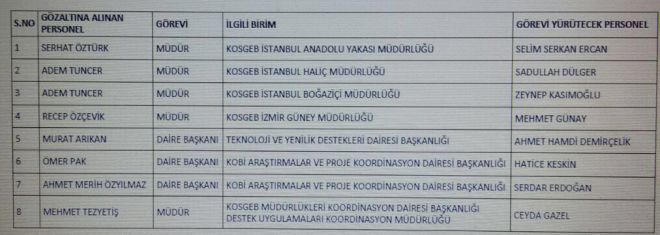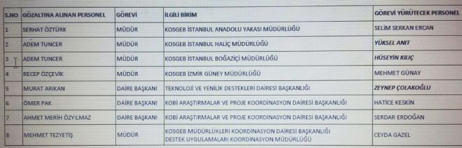 Haklarında gözaltı kararı verilen KOSGEB idarî kadrosu yerine yapılan atamalarda revizeye gidildi. KOSGEB'teki Dev FETÖ Operasyonu sonrası yapılan yeni atamalar kafalarda soru işareti bırakmıştı. Yazılan görevlendirme yazısında haklarında gözaltı kararı verilen personel görevlerine dönünceye kadar ibaresi dikkat çekmişti. Bu arada, Anayasal düzene karşı suçlar bürosu tarafından gözaltı kararı verilen yönetici pozisyonundaki personelin tekrar yönetici kadrolarına edilecekler mi? sorusu da kafa karıştırdı. KOSGEB içindeki bazı güvenilir kaynaklar, görevden uzaklaştırılan ve gözaltına alınan personelin soruşturmanın selameti açısından yönetici kadrolarında görev yapmaya devam etmelerinin sakıncalı olduğunu savunuyor. Ayrıca, aynı kaynaklar yapılan görevlendirmelerde bile sıkıntı olduğu düşüncesini taşıyor.
