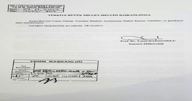 MHP Grup Başkanvekili ve aynı zamanda Kayseri Milletvekili adayı Yusuf Halaçoğlu, Ayasofya tartışmalarını değerlendirdi ve AK Parti’yi ve Cumhurbaşkanı Recep Tayyip Erdoğan’ı, 'samimiyetsizlikle' suçladı. Bu konuda MHP olarak Ayasofya’nın ibadete açılması için TBMM Başkanlığı'na 20.10.2013 tarihinde kanun teklifi sunduklarını ancak bunun iktidar tarafından gündeme alınmadığını belirten Halaçoğlu, bu konudaki kanun tekliflerinin belgesini de kamuoyu ile paylaştı.