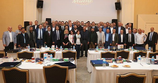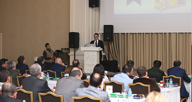 Fabrika gezisinin ardından Mutlu Makarna Yönetim Kurulu Üyesi Ali Göymen Grand Otel’de Mutlu Makarna’nın en son çıkarmış oldukları ürünlerle ilgili bir sunum yapılarak katılımcılara bilgi aktarıldı. Göymen, Mutlu Makarna hakkında katılımcılara kısa bilgiler sundu.