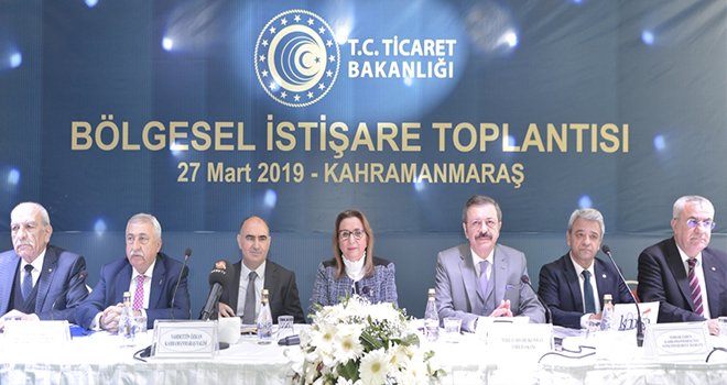 Kahramanmaraş’da düzenlenen Bölgesel İstişare Toplantısı; Ticaret Bakanı Ruhsar Pekcan, TOBB Başkanı M. Rifat Hisarcıklıoğlu, TESK Başkanı Bendevi Palandöken, Kahramanmaraş Valisi Vahdettin Özkan, Kahramanmaraş Ticaret ve Sanayi Odası Başkanı Serdar Zabun, Kahramanmaraş Ticaret Borsası Başkanı Ahmet Duran Balsuyu ile Afşin, Elbistan, Adıyaman, Gaziantep, Osmaniye, Kilis, Şanlıurfa ve Hatay’dan Oda ve Borsaların katıımıyla Kahramanmaraş Ticaret ve Sanayi Odası’nda gerçekleştirildi.