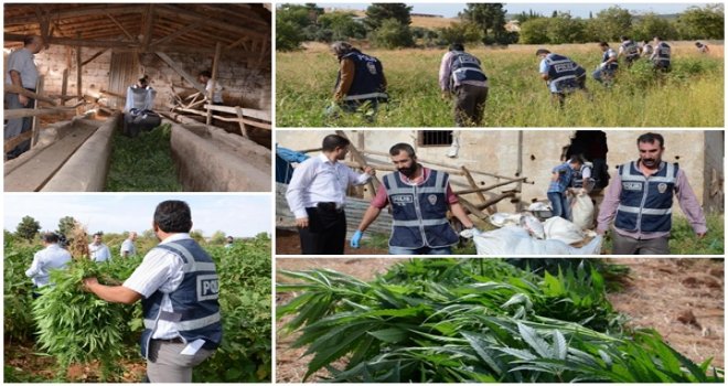 Gaziantep'te, polisin düzenlediği operasyonda patlıcan tarlasına 5 bin kök hintkeneviri ile 100 kilo esrar ele geçirdi, baba ile oğlunu gözaltına aldı.