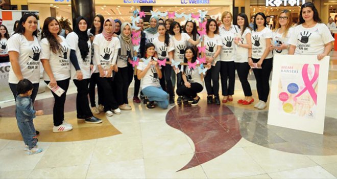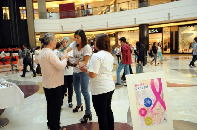“Meme Kanserinden Korkmuyorum, Çünkü Farkındayım” sloganıyla düzenlenen etkinlikte, ziyaretçilere pembe kurdele dağıtıldı.