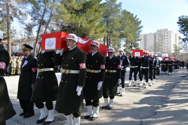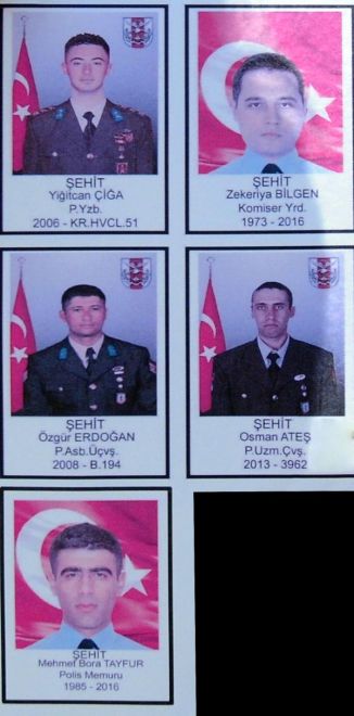 Kayseri 1'inci Komando Tugayı'ndan geçici görevle Diyarbakır'ın Sur İlçesi'ne gönderilen şehitlerden Yüzbaşı Yiğitcan Çiğa, Astsubay Üstçavuş Özgür Erdoğan, Uzman Çavuş Osman Ateş ile Diyarbakır Özel Harekat Şube Müdürlüğü'nde görevli Komiser Yardımcısı Zekeriya Bilgen ile Özel Harekat polisi Bora Tayfur’un cenazeleri askerler tarafından ambulanstan alınarak katafalka konuldu.
