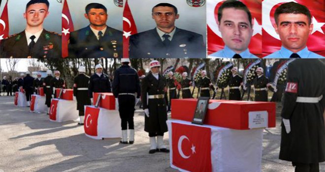 Diyarbakır’ın Sur İlçesi'nde dün PKK’lı teröristlerle çıkan çatışmada şehit olan Yüzbaşı Yiğitcan Çiğa, Astsubay Üstçavuş Özgür Erdoğan, Uzman Çavuş Osman Ateş, Özel Harekat Komiser Yardımcısı Zekeriya Bilgen ile bu sabah tedavi gördüğü hastanede şehit olan Özel Harekat polisi Bora Tayfur, Diyarbakır Asker Hastanesi'nde düzenlenen törende gözyaşlarıyla, toprağa verilmek üzere memleketlerine uğurlandı.
