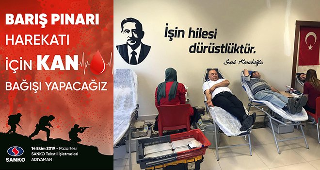 SANKO Holding’in Adıyaman’daki yatırımlarından Sanko Tekstil İşletmeleri yönetici ve çalışanları, Türk Silahlı Kuvvetleri’nin gerçekleştirdiği Barış Pınarı Harekâtı’na destek olmak amacıyla kan bağışı yaptı.