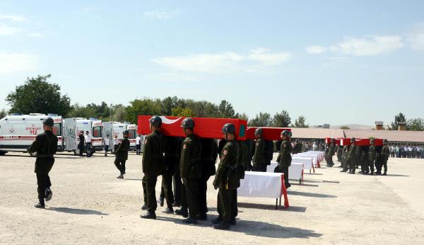 Siirt'in Şirvan ve Pervari ilçelerini bağlayan karayolunda dün yapılan saldırıda şehit olan uzman çavuşlar Hakan Aktürk, Ferdi Gerekli ve Barış Akın ile erler Bahadır Aydın, Recep Beycur, Ömer Erüstün, Emre Kaan Arlı ve Mehmet Halil Barkın'ın cenazeleri, bu sabah Devlet Hastanesi morgundan alınarak 3'üncü Komando Tugay Komutanlığı'nın Omurtak Kışlası'na getirildi.