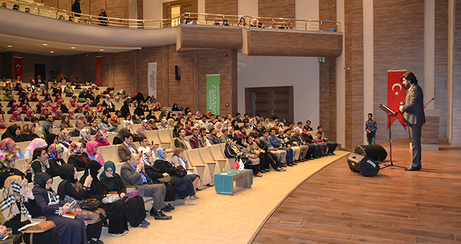 Şiirin ardından konuk Prof. Dr. Mehmet Emin Ay’ı sahneye davet etti. Prof. Dr. Mehmet Emin Ay, “Mübarek günlerde güzel bir vesileyle yad etmek şükretmek için, Rabbimizin adıyla başlar, selam olsun diyerek Rabbimizin bereketi, güzellikleri üstünüze olsun, geceniz mübarek olsun sözleriyle” konuşmasına başladı. “Peygamberimizi gönül gözüyle tanımak gerekir. Peygamberimizi tanıdıkça seveceğiz. Sevdikçe O’nu daha iyi tanıyacağız” şeklinde konuştu.