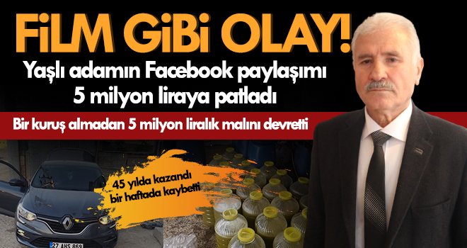 Gaziantep’te yaşayan Murtaza Sucu’nun zeytinyağını sosyal medya hesabı üzerinden satmak istemesi ona pahalıya patladı. 74 yaşındaki adamla satılık zeytinyağı ilanı üzerinden irtibata geçen dolandırıcılar film gibi bir dolandırıcılık olayına imza attı. Yaşlı adamı iş adamı rolüyle kandıran dolandırıcılar, Sucu’nun 500 bin liralık sıfır otomobiliyle 4.5 milyon lira değerindeki arazisini bir kuruş bile ödemeden üzerlerine geçirdi.