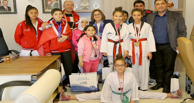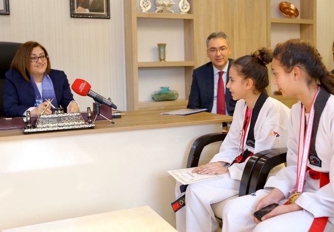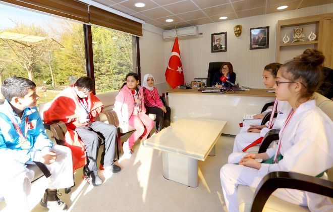 Gaziantep Büyükşehir Belediyesi Sanat ve Meslek Eğitim Kursları (GASMEK) bünyesinde hizmet veren sosyal tesislerde eğitim gören ve Karate ile Teakwondo’da dereceye giren öğrenciler, Büyükşehir Belediye Başkanı Fatma Şahin’i ziyaret etti.