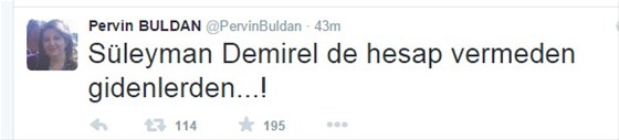 HDP Grup Başkanvekili Pervin Buldan, Süleyman Demirel'in ölümü üzerine Twitter üzerinden tepki çekecek bir mesaj paylaştı.
