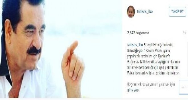 Şanlıurfa’da, seçimlere bağımsız aday olarak girmek için başvuru yapan ancak daha sonra bu kararından vazgeçen türkücü İbrahim Tatlıses, sosyal medya kanalı Instagram'dan seçmenlere kendisine oy vermemesi mesajını paylaştı.