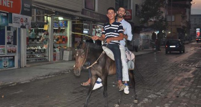 İslahiye’nin en işlek noktalarından Hakkı Demirel Caddesi üzerinde trafik akışına aldırış etmeden ata binen iki kişinin gezintisi görenleri şaşırttı. Görenlerin dikkatini çeken gençlerden Cihan Temtek, "Polisler motosikletlerimize 3 bin 500 lira ceza yazdı. Bu durumu protesto etmek için biz de ulaşımımızı at ile sağlıyoruz" dedi.