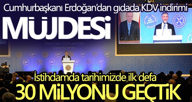 Cumhurbaşkanı Recep Tayyip Erdoğan, ''Enflasyonla mücadele topyekun bir inancı ve topyekun bir fedakarlığı gerektirir. Hükümet olarak biz, bu konuda atmaya söz verdiğimiz adımları, birer birer hayata geçiyoruz. KDV sistemini sadeleştirme programımız kapsamında, temel gıda ürünlerinde yüzde 8 olan KDV’yi yüzde 1’e indiriyoruz'' dedi.