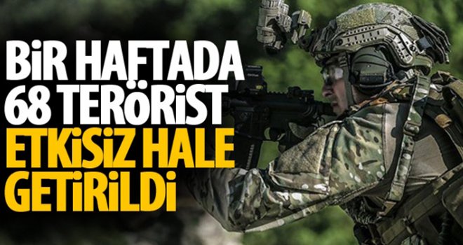 Türk Silahlı Kuvvetleri (TSK) tarafından terör örgütlerine yönelik yurt içinde ve dışında yürütülen operasyonlarda, geçen hafta, 2'si sözde lider kadroda yer alan, 12'si yurt içinde 56'sı yurt dışında olmak üzere 68 terörist etkisiz hale getirildi.