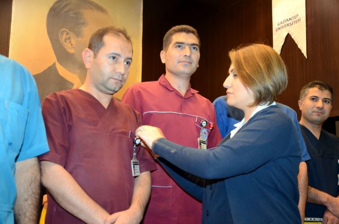 Törende yılın personeli seçilen, Hemotoloji Kliniği Hemşiri Sadık Çetin, İç Hastalıkları Yoğun Bakım Klinik Sekreteri, Çiğdem Dikici, Romatoloji Poliklinik Sekreteri Mehmet Çılgın, Nefroloji Kliniği Hasta Bakıcı Ali Yıldız, Genel Alanlar Temizlik Personeli Hüseyin Yalçın ve Güvenlik Personeli Hamiyet Çicek ödüllerini Gaziantep Üniversitesi Rektör Yardımcısı Prof. Dr. Ali Gür'ün ellerinden aldı.