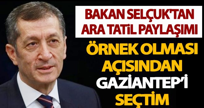 "Sevgili anne babalar, bu yıl ilk kez ülkemizde bir ara tatil uygulanıyor. Cuma günü itibariyle çocuklar bir hafta tatildeler, biz istedik ki bu bir hafta eğitime okul dışında oyunla, kültürle, bilimle, sanatla, etkinliklerle değerlerimizle devam edelim, çocuklarımız için bir ara tatil etkinlik planı hazırladık. Ben örnek olması açısından Gaziantep’i seçtim. Bakın burada pazartesiden cumaya kadar çocukların katılabileceği uzun bir etkinlik listesi var. Lütfen bulunduğunuz ili seçerek, buradaki etkinlikleri inceleyin ve katılabildiğiniz ölçüde katılım gösterin. Hepinize şimdiden verimli ve huzurlu tatiller diliyorum."