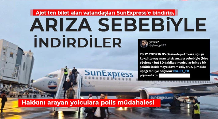 İddiaya göre, dün saat 16.05'te Gaziantep'ten Ankara'ya gitmek için Ajet'ten bilet alan vatandaşlar, SunExpress uçağına bindirildi. Ancak uçakta, kulaklık sisteminde meydana gelen arıza nedeniyle yolcular iki saat boyunca bekletildi. Arızanın giderilememesi üzerine yolcular uçaktan indirildi.