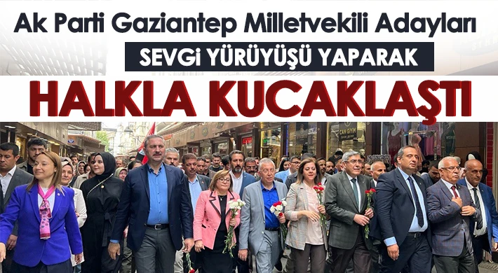 Cumhurbaşkanlığı seçimine sayılı günler kala sahada tüm hızıyla çalışmalarına devam eden Milletvekili Adayları, düzenlenen sevgi yürüyüşünde Gaziantep halkı tarafından yoğun ilgiyle karşılandı. Vatandaşlarla seçim hakkında konuşmalar yaparak, ‘Yaparsa AK Parti yapar, Gaziantepliler için durmak yola devam” parolasını görev edindiklerini ifade eden adaylara vatandaşlar alkış tutarak karşılık verdi.