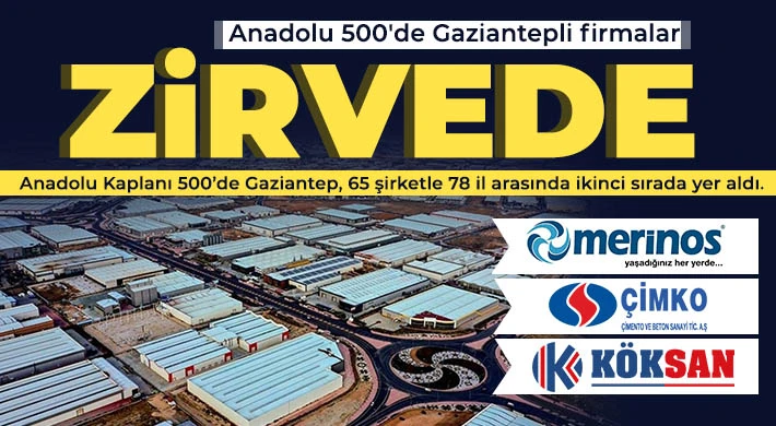 Anadolu Kaplanı 500’de Gaziantep, 65 şirketle 78 il arasında ikinci sırada yer aldı. Şirketler sıralamasında zirvede Gaziantep’ten iki şirket bulunuyor. Tiryaki Agro, ikinci sırada, üçüncü sırada Erdemoğlu Holding’in iştiraki Sasa bulundu. En çok şirket iştirakiyle Sanko Holding 8 şirketiyle Kipaş’dan sonra ikinci oldu. Gaziantep; ambalaj, çimento, enerji, tekstil, halı, gıda, imalat, kimya, otomotiv, tarım ve ticaret hizmet sektörlerinde de damgasını vurdu.