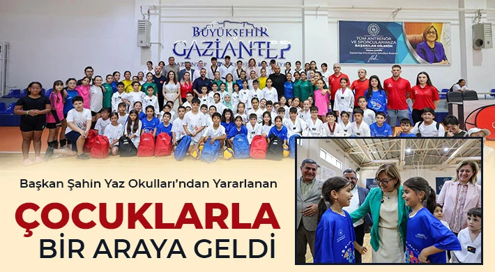 Çocukların yaz aylarında hem eğlenerek hem öğrenerek spor bilinci kazanmalarını; takım ruhu ve disiplin duygusu geliştirmelerini hedefleyen spor okulları devam ediyor. Sağlıklı nesillerin yetişmesi amacıyla her branşta kaliteli spor eğitimi verilen Gaziantep Büyükşehir Belediyesi Yaz Okulları’nda öğrenciler, Başkan Şahin ile bir araya geldi.
