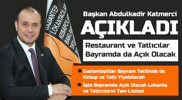 Gaziantep Lokantacılar Kebapçılar Pastacılar Tatlıcılar Baklavacılar ve Kafeteryacılar Esnaf ve Sanatkarları Odası Yönetim Kurulu Başkanı M. Abdulkadir Katmerci, Bayram tatilini Gazi şehrimizde geçirecek olan misafirlerin mağduriyet yaşamaması adına bayramın ilk 3 gününde de lokanta, baklava ve katmercilerin nöbet usulü açık olacağının müjdesini verdi.